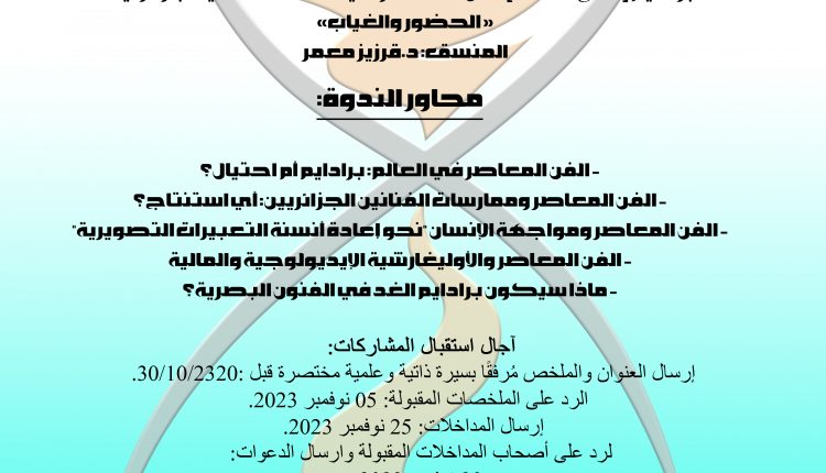 أخر الأخبارالمستجداتالملتقيات الندوة الوطنية الموسومة : براديم الفن المعاصر في المشهد الفني الجزائري بواسطة levpaa آخر تحديث أكتوبر 1, 2023 0 شارك 0 شارك FacebookTwitterGoogle+ReddItWhatsAppPinterestالبريد الإلكتروني